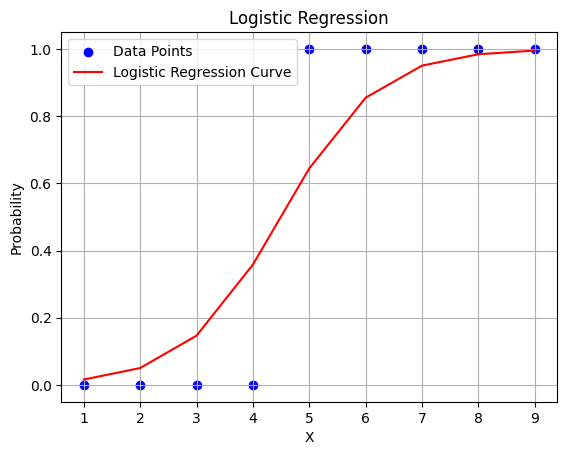 y = np.array([0, 0, 0, 0, 1, 1, 1, 1, 1]) # Binary outcome (0 or 1)# Creating a logistic regression model