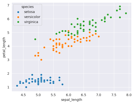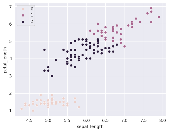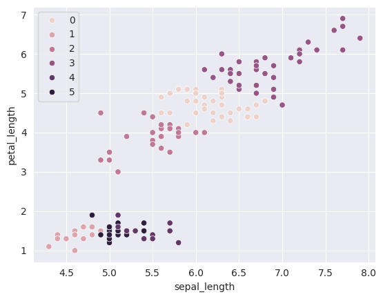 3, 0, 3, 3, 3, 3, 0, 3, 3, 3, 0, 3, 3, 3, 0, 3, 3, 0], dtype=int32)sns.scatterplot(data=X, x='sepal_length', y='petal_length', hue=preds);