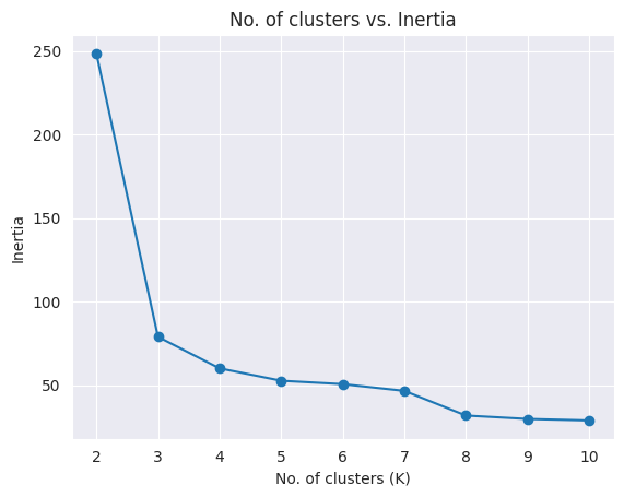 model.inertia_50.560990643274856In most real-world scenarios, there’s no predetermined number of clusters. In such a case, you can create a plot of “No. of clusters” vs “Inertia” to pick the right number of clusters.