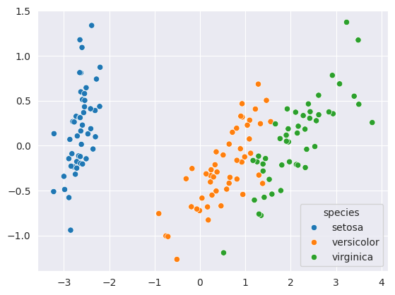 transformed = pca.transform(iris_df[numeric_cols])sns.scatterplot(x=transformed[:,0], y=transformed[:,1], hue=iris_df['species']);