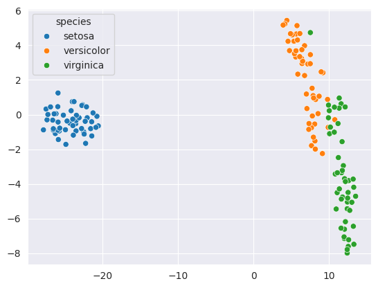 from sklearn.manifold import TSNEtsne = TSNE(n_components=2)transformed = tsne.fit_transform(iris_df[numeric_cols])sns.scatterplot(x=transformed[:,0], y=transformed[:,1], hue=iris_df['species']);