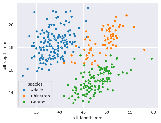 sns.scatterplot(data=ping_df, x='bill_length_mm', y='bill_depth_mm', hue='species');
