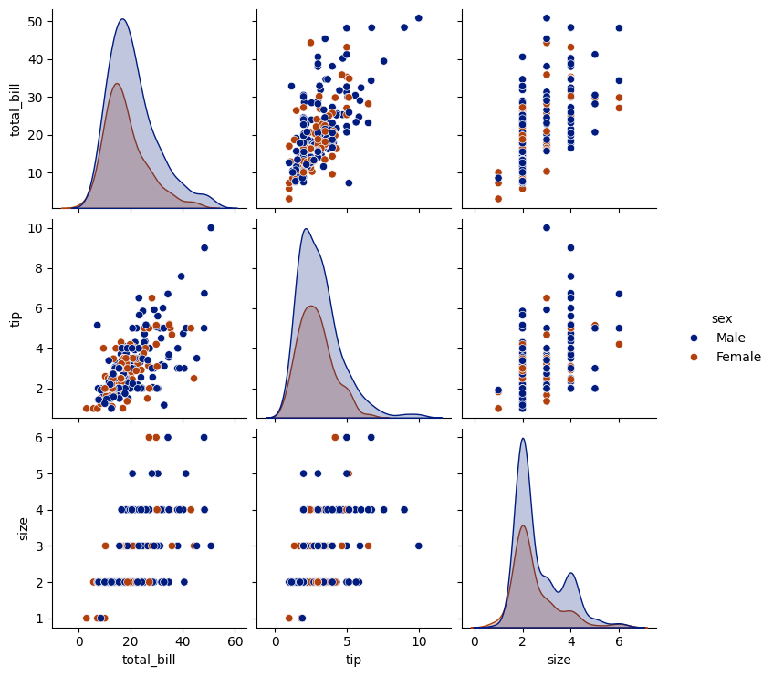 sns.pairplot(tips, hue='sex')