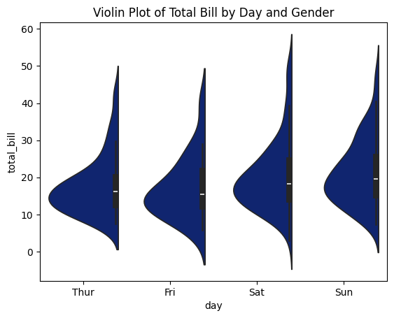 plt.title('Violin Plot of Total Bill by Day and Gender')