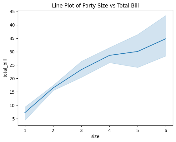 plt.title('Line Plot of Party Size vs Total Bill')