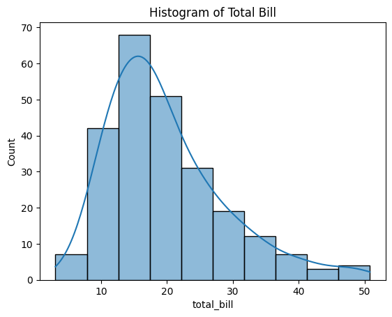 plt.title('Histogram of Total Bill')
