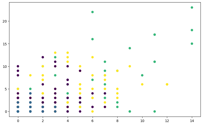 plt.scatter(fpl_sample.Assists, fpl_sample.Goals_Scored, c=labels_unscaled, cmap='viridis',)